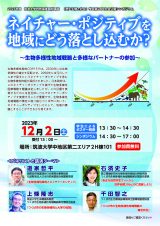 2023年12月2日 一般の方向け受験生の方向け学生の方向け研究者の方向け (要申込:11/27締切)「野生生物と社会」学会第28回大会公開シンポジウム「ネイチャー・ポジティブを地域にどう落とし込むか?~生物多様性地域戦略と多様なパートナーの参加~」 詳しくはこちら