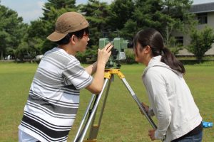 経緯儀を用いた風の観測の様子。風船を上手に追いかけるには訓練が必要